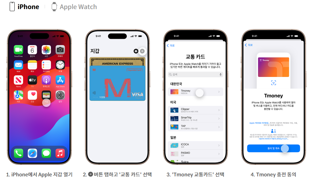 아이폰과 애플워치 각각 티머니 카드를 등록해야 해요.