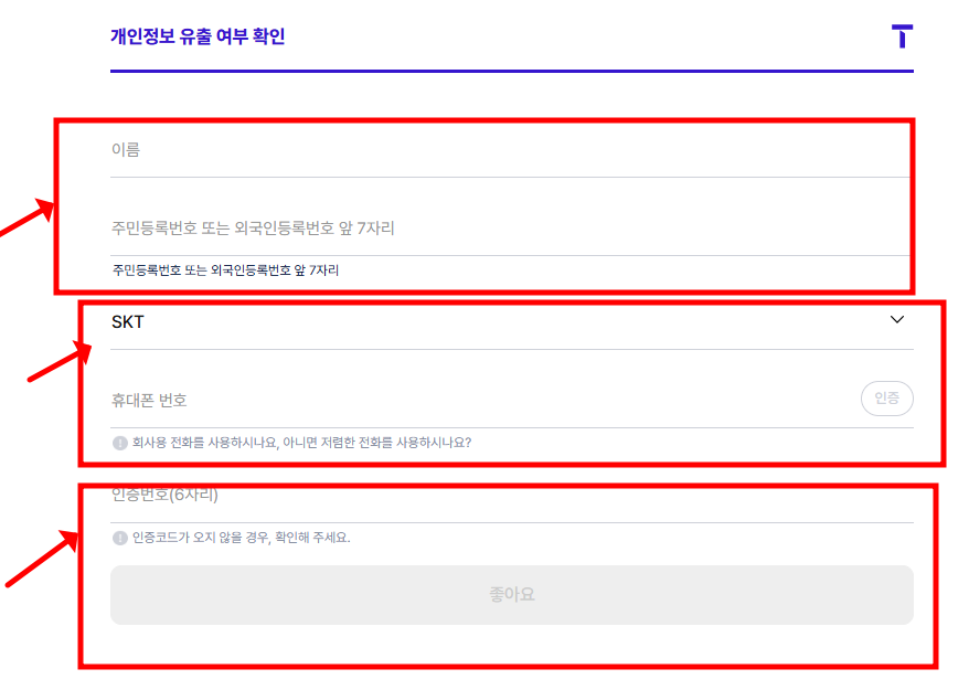 해당 서비스는 본인 인증을 완료한 고객에 한해, 실제로 내 개인정보가 유출되었는지를 확인할 수 있는 기능을 제공합니다.