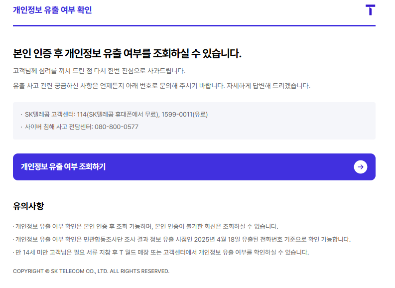 - 유출 여부 확인은 2025년 4월 18일에 유출된 전화번호 기준으로 진행됩니다.