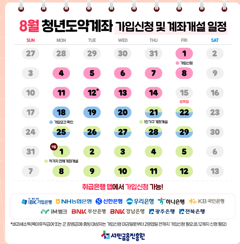2025년 2월 청년도약계좌 신청은 2월 3일부터 14일까지 진행됩니다. 계좌 개설일은 1인 가구는 2월 20일~3월 14일, 2인 이상 가구는 3월 4일~14일로 다르니 반드시 확인해야 합니다.