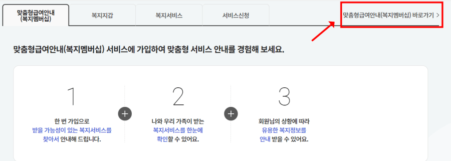 일단복지로사이트를접속 후에보이시는화면오른쪽상단에보시면맞춤형 급여(복지멤버십) 바로가기있습니다그걸클릭 후에들어가시면 됩니다