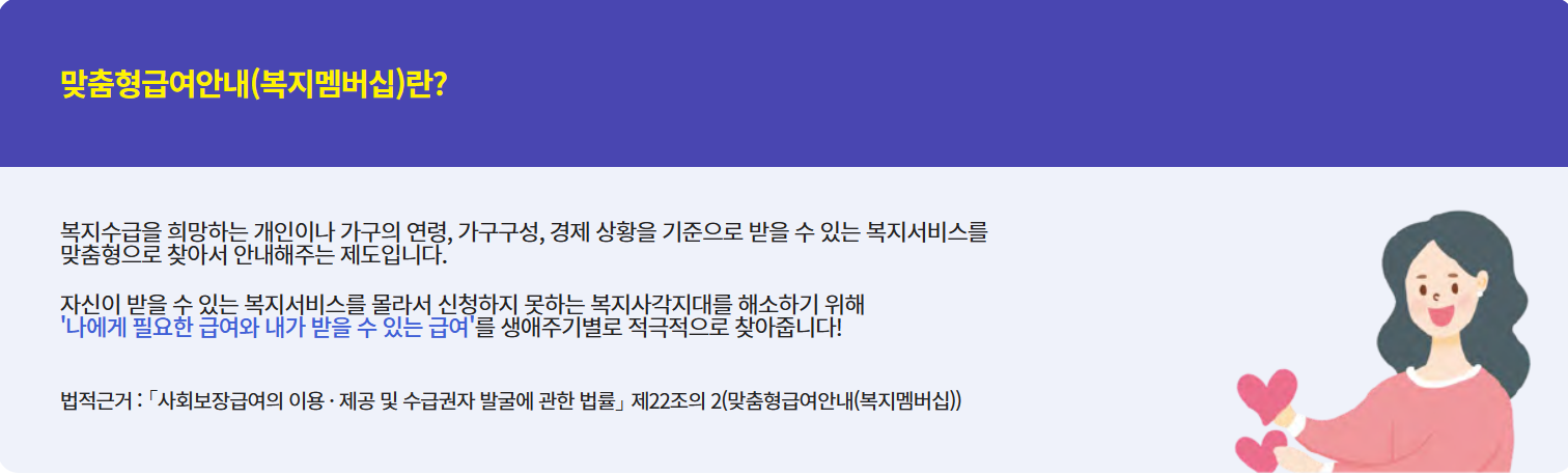 자신이받을 수 있는복지서비스를몰라서신청조차못하는복지사각지대를해소하고자위한복지수급을희망하는개인이나가구의연령,가구구성,경제상황을기준받을수있는복지서비스를맞춤형찾아서안내하는제도입니다