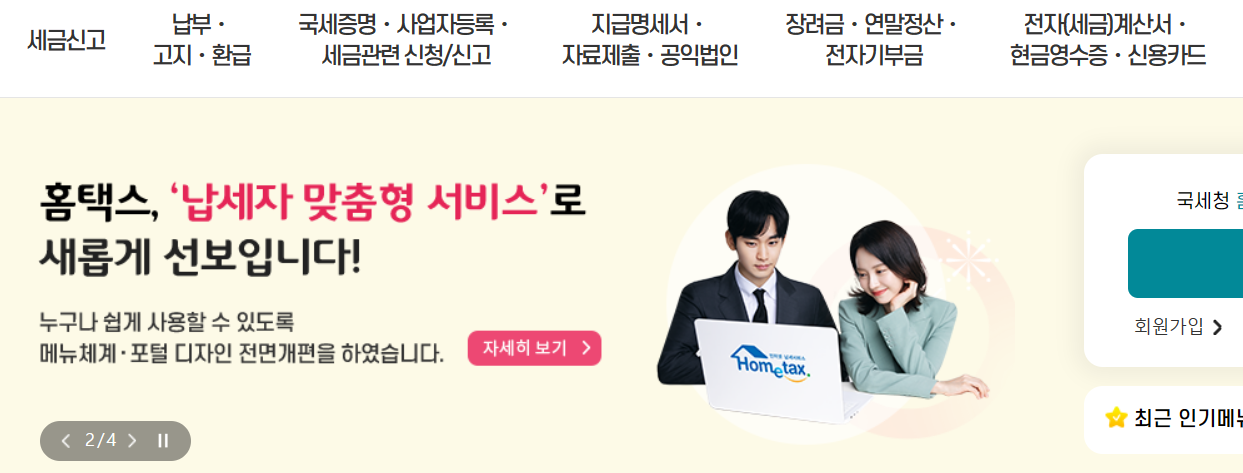 국세청홈페이지접속하시면'위에 상단세 번째에국세증명, 사업자등록, 세금 관련신청 및 신고클릭하시고
