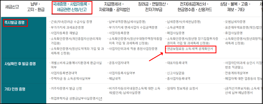 즉시발급증명-연금보험 등 소득세액공제확인서보이실 거예요그걸클릭하시면 됩니다