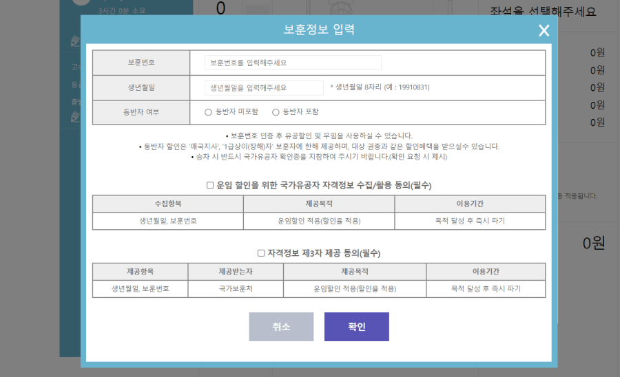 보훈 할인권 구매 방법은 여행일정을 선택한 다음에 마지막 화면에 아래와 같이 선택하면 돼요