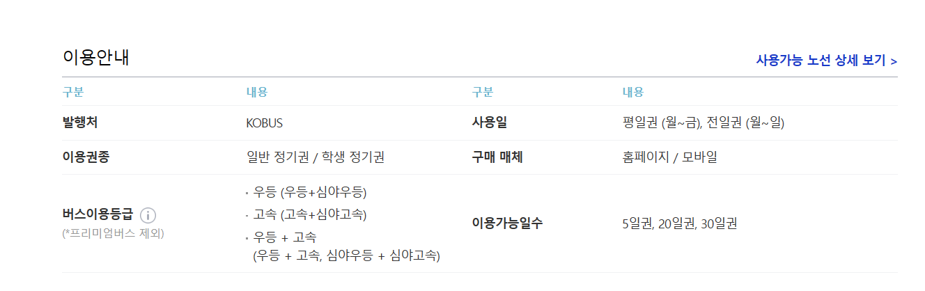 일반정기권, 학생정기권구분이 되어나눠어지어있으며,이용등급은일반, 우등, 심야있으며