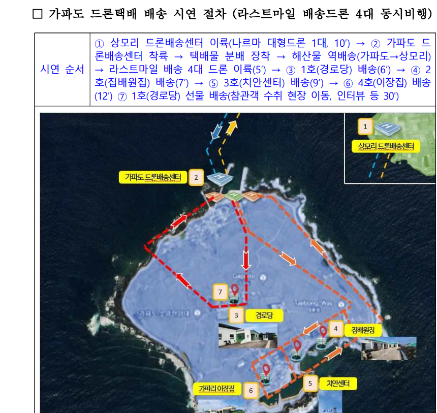 가파도시연순서는상모리드론배송센터이륙, 나르마대형 드론 1대, 가파도드론배송센터-택배물분배장작-해산물역배송(가파도-상모리)-라스트마일배송 4대 드론이륙-1호(경로당) 배송-2호(집배원집) 배송-3호(치안센터) 배송-4호(이장집) 배송-1호(경로당) 선물배송(참관객수취현장이동, 인터뷰등)