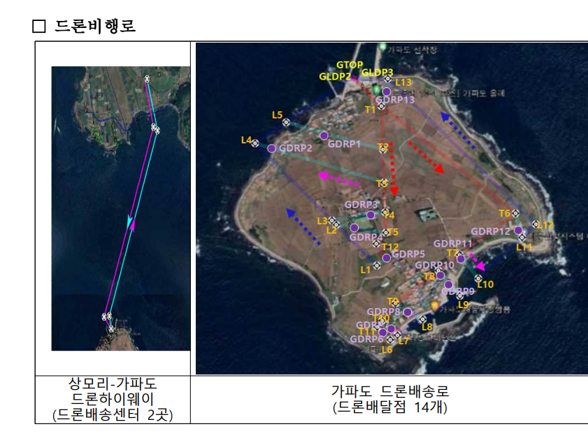 2. 비행로:드론하이웨이(상모리-가파도), 드론배송로(배송센터-배달점)