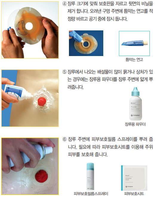 5. 장루에서 나오는 배설물이 많이 물거나 상처가 있경우에는 장루용 파우더를 장루 주변에 얇게뿌