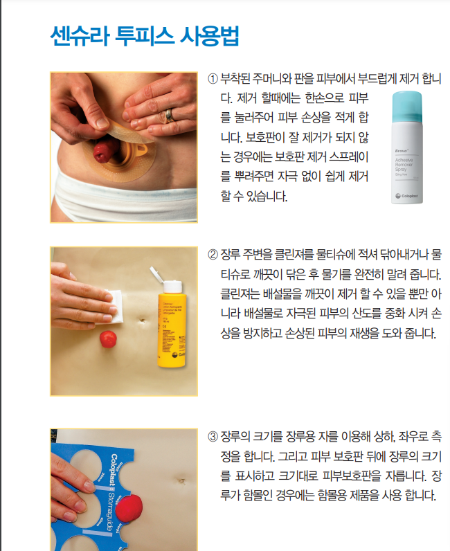 1. 부착된 주머니와 판을 피부에서 부드럽게 제거합니다. 제거할 때에는 한 손으로 피부를 놀러 주어 피부 손상을 적게 합니다다. 보호판이 잘 제거가 되지 않는 경우에는 보호판 제거 스프레이를 뿌려주면 자극 없이 쉽게 제거할 수 있습니다.