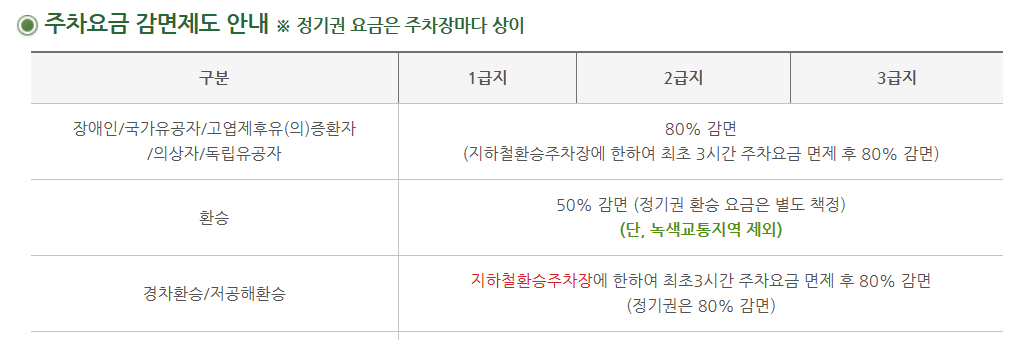 2. 환승공영주차장 1회 한하여 3시간 면제그 이상은요금80% 할인장애인동승해야 할 인적용 받을 수 있습니다