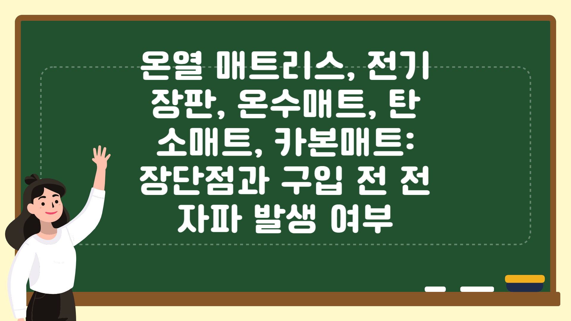 온열 매트리스, 전기장판, 온수매트, 탄소매트 및 카본매트는 따뜻함을 제공하는 다양한 제품들입니다. 오늘포스팅 각 제품의 장단점과 구입 전 전자파 발생 여부에 대해 알아보겠습니다. 이를 통해 사용자들이 안전하고 적합한 선택을 할 수 있도록 도움을 드리려고 합니다