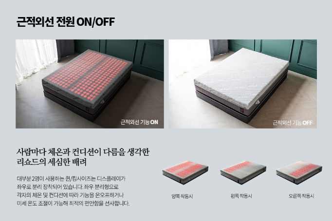 매트리스안에탄소섬유패드를삽입하거나몇 개의led를넣어서원적외선이발산된다는 제품입니다온열매트리스는써보신 분들은잘 아실 거예요일단우리가봐야 될 건전자파방출량, 원적외선led있으면 투과인증을확인해봐야 하고전자제품이라면전자파생기기 마련이죠100프로 차단할 수 어렵지만led칩이신체와굉장히 밀접해야만 하고투과가되고효과 볼 수 있다는 거죠여성분이 시라면led마스크랑밀접하다고 해야 하시면맞을 것 같습니다