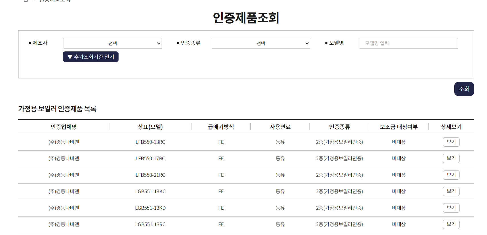친환경보일러인증제품업체별로조회. 모델사용연료, 인증종류, 보조금대상여부. 상세 보기가능하기 때문에본인의보일러가인증제품에해당하는지조회가능하니참고하시길 바랍니다