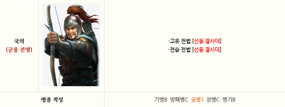 1. 신규장수:국의 선등결사대이고, 전승전법, 선등결사대입니다 병종적성으로 기병 B, 벙패병 C, 궁병 S, 창병 C, 병기 B입니다
