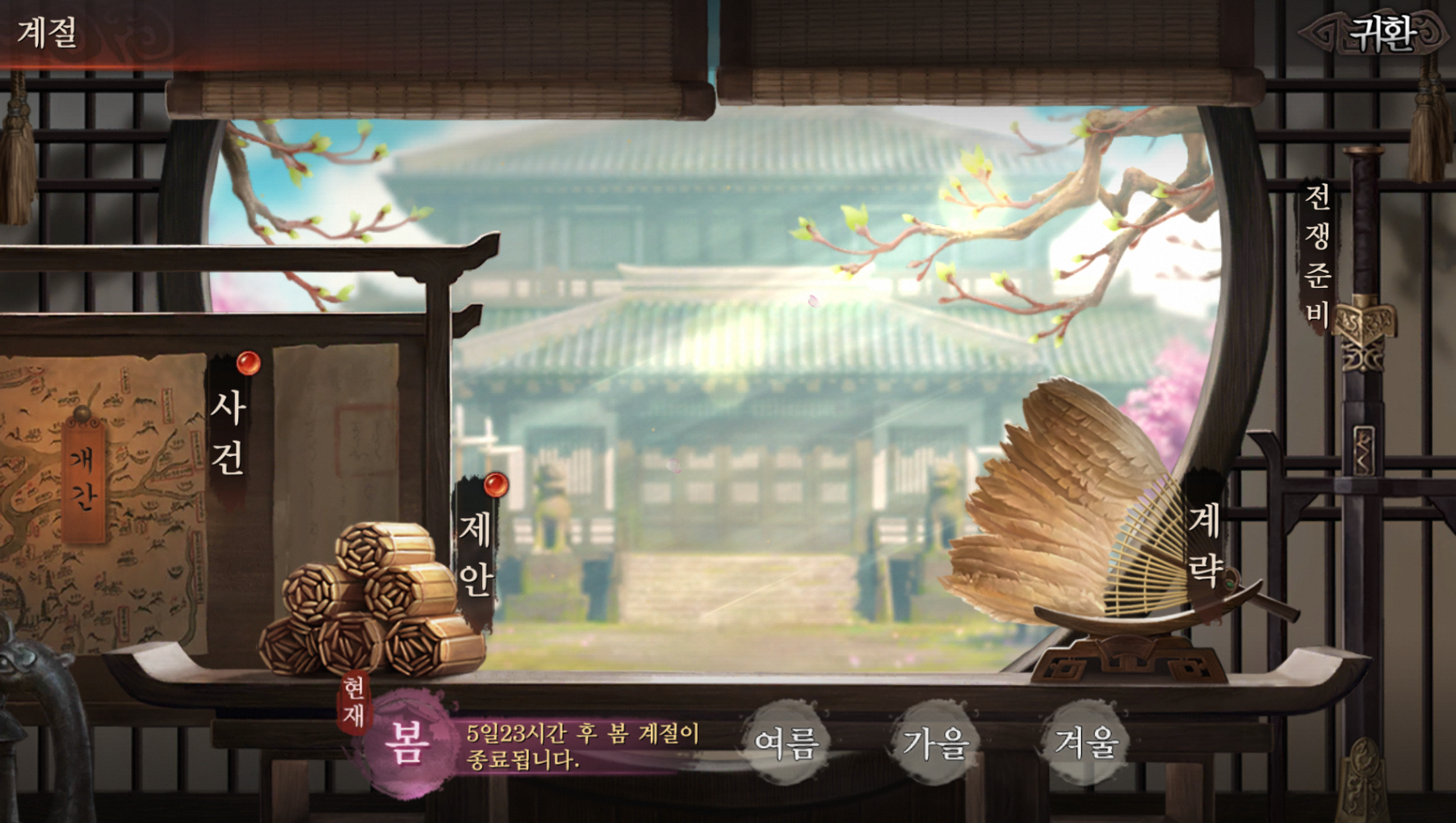 봄은 성지발전의 관련이며. 여름은 전투버프 위주이고. 가을은 도전, 투항명령과 겨울은 방어강화 관련된 어이 싸고 합니다