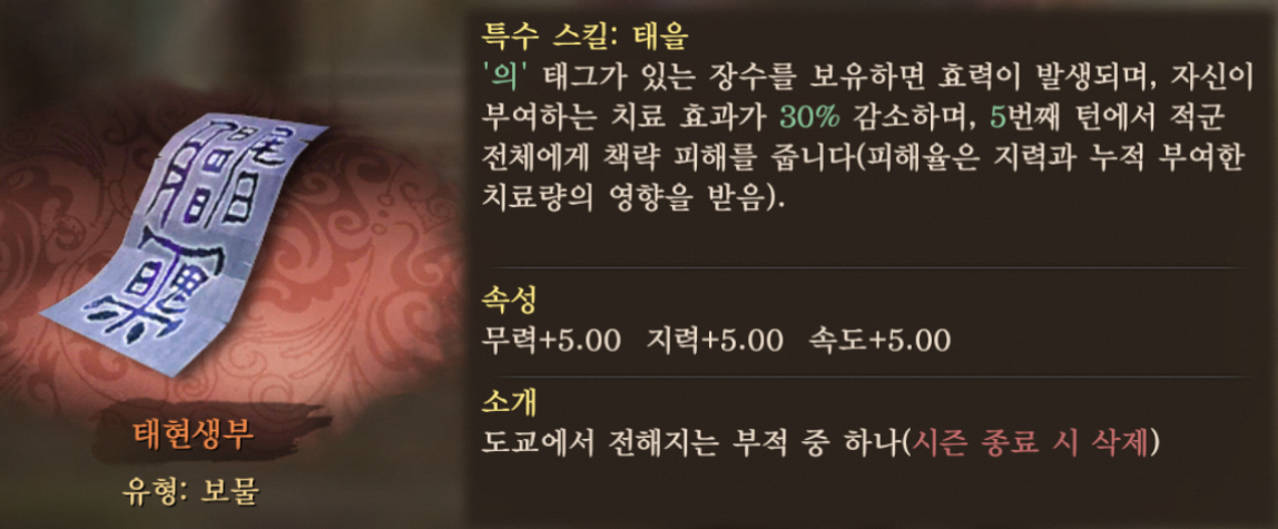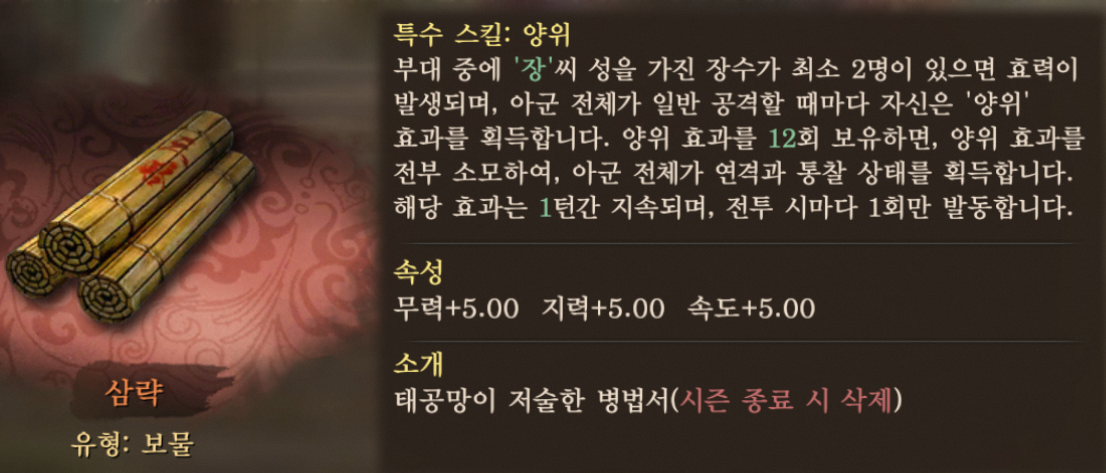 1. 포지션:준비전법이 많은 진용에 적합합니다. 보물을 장착한 장수의 고유준비전법의 발동률과 피해를 증가, 일정한 확률, 통팔효과를 획득가능