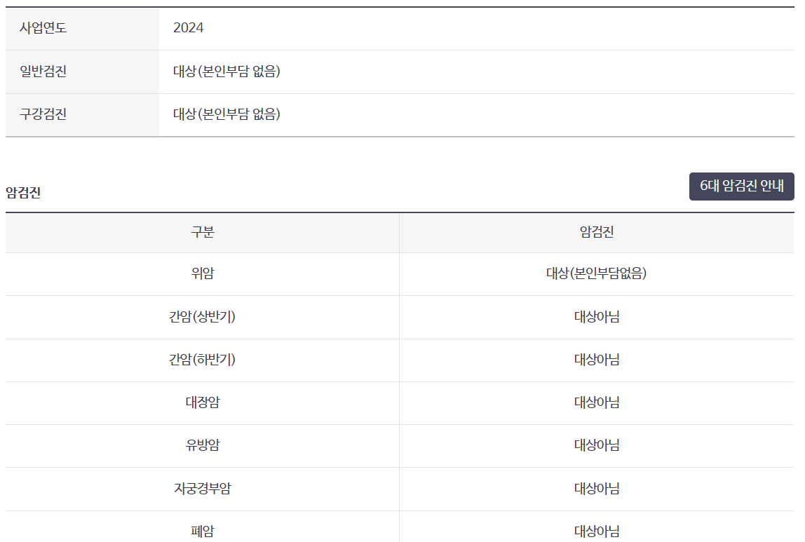 건강검진대상자조회를선택하시면본인의생년월일,대상구분이나오게 됩니다그리고일반검진, 구강검진, 암검진세 가지항목이있습니다암검진의경우연령에 따라서대상인경우또는아닌경우로나누어구분됩니다