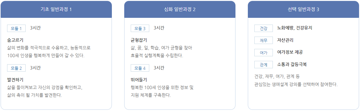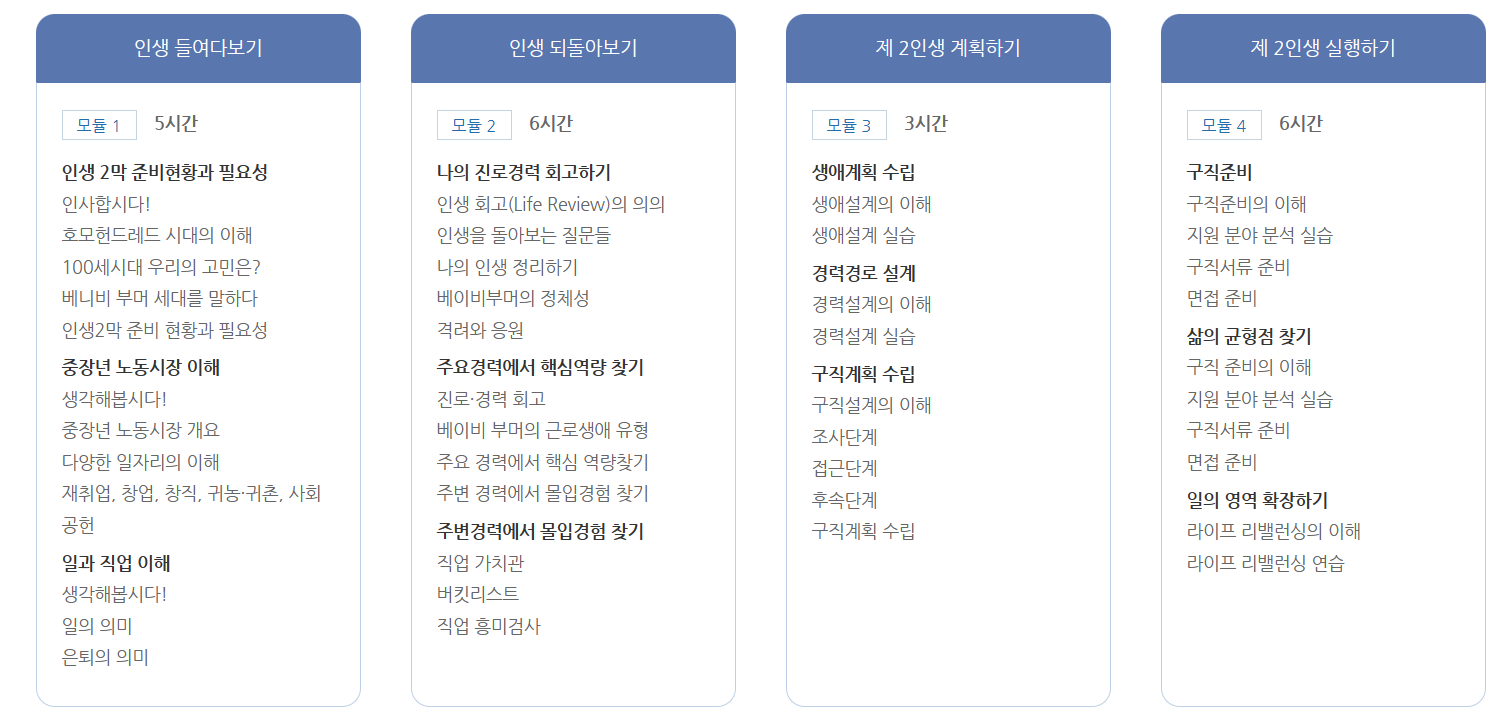 만으로50세이상재직자대상의프로그램으로써,경력설계에대한이해하고본인스스로의생애를되돌아보며평생경력계획수립에도움을주는서비스입니다