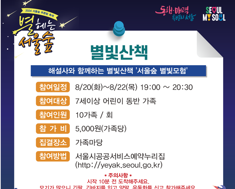 서울숲의 특별한 밤을 경험할 수 있는 '별혜는 서울숲' 축제! 많은 참여 부탁드려요. 축제에 대한 자세한 정보와 일정은 서울숲 공식 홈페이지에서 확인하실 수 있습니다. 여러분의 많은 관심과 참여 바랍니다.