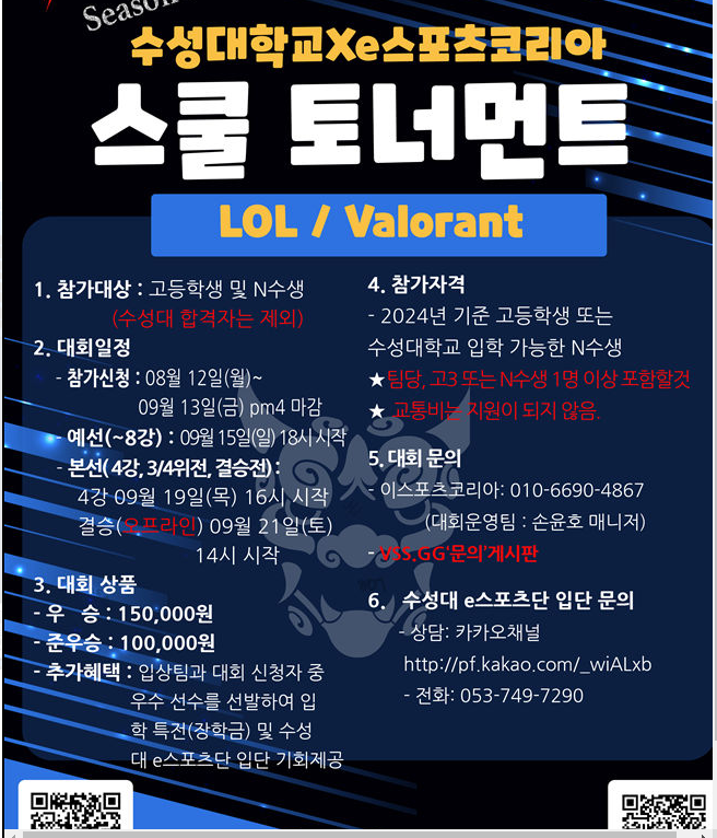 수성대학교와e스포츠코리아가함께주최하는'스쿨토너먼트'가열립니다!이번대회는리그오브레전드(LOL)와발로란트(VALORANT)두종목으로진행되며,고등학생및N수생들이참가할수있습니다.미래의e스포츠스타가될수있는이기회에많은관심과참여부탁드립니다.
