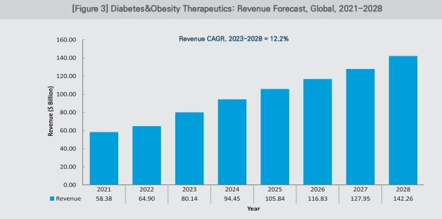 최근 발표된 보고서에 따르면, 글로벌 비만 및 당뇨병 치료제 시장은 향후 5년 동안 연평균 12.2%의 성장률을 기록할 것으로 보입니다. 2023년 시장 규모는 801억 달러에서 2028년 1,423억 달러로 두 배 가까이 증가할 전망입니다.
