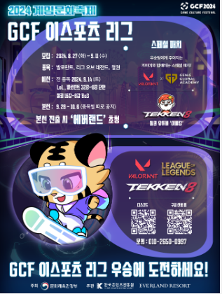 에버랜드에서 펼쳐지는 2024 게임문화축제 GCF 이스포츠 리그! 갤럭시북과 고급 게이밍 마우스를 차지할 영광의 주인공이 될 기회를 잡아보세요. 발로란트, 리그 오브 레전드, 철권에서 최강의 팀을 뽑는 이 대회에 여러분의 도전을 기다립니다!