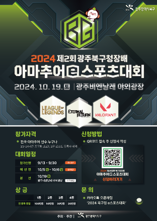 이번 2024 제2회 북구청장배 e스포츠대회에 많은 관심과 참여 부탁드립니다! 여러분의 열정과 능력을 확장할 수 있는 멋진 기회가 될 것입니다. 함께하고 의미 있는 권위를 확인할 수 있습니다! 많은 참여 기다리겠습니다!