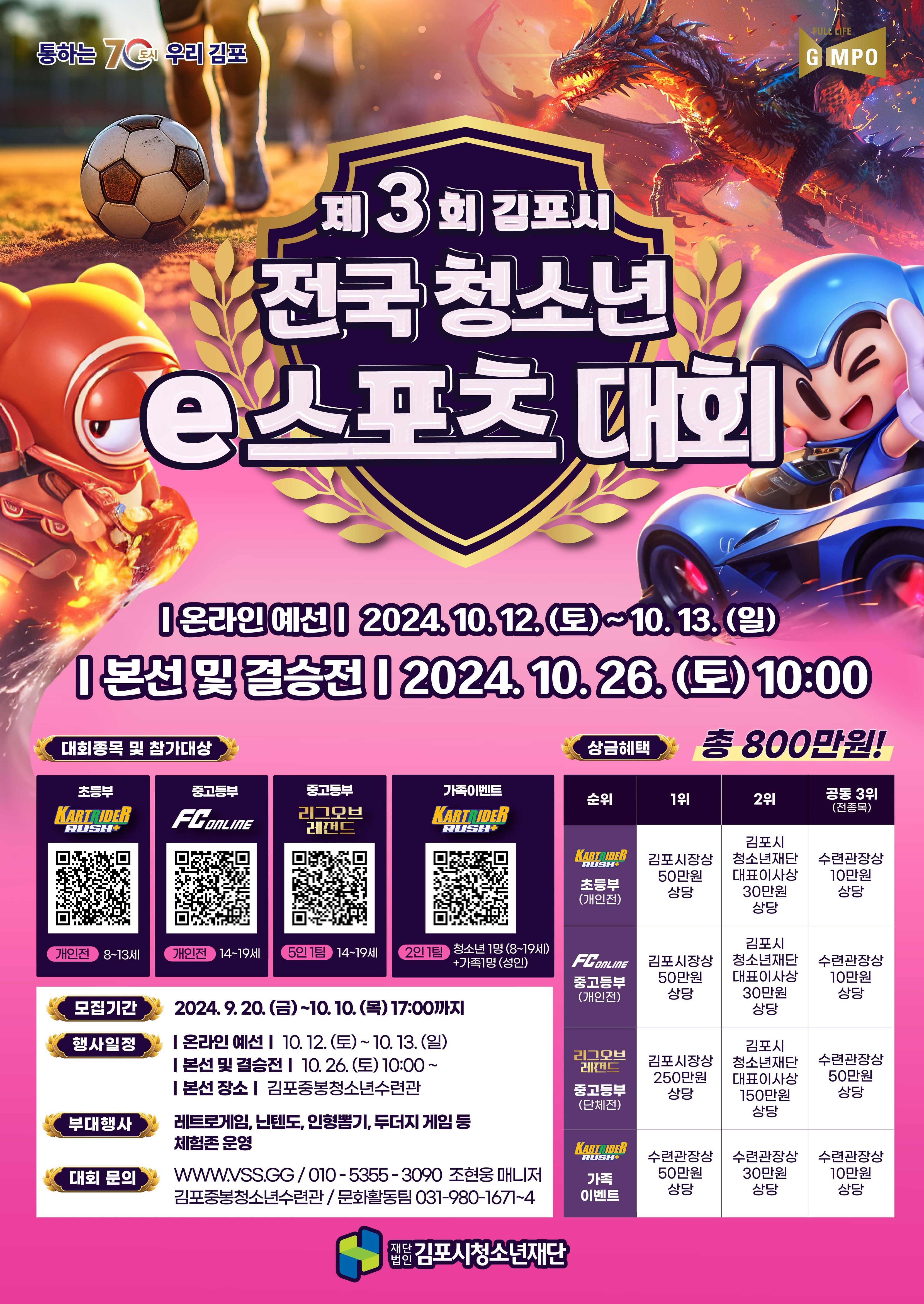 이번 제3회 김포시 전국 청소년 e스포츠 대회는 청소년과 가족이 함께 즐길 수 있는 특별한 기회입니다. 다양한 종목과 풍성한 상금, 그리고 즐거운 부대 행사가 마련되어 있으니 관심 있는 분들은 놓치지 말고 참여해보세요! 여러분의 멋진 플레이를 기대하겠습니다. 많은 참여와 성원 부탁드립니다!