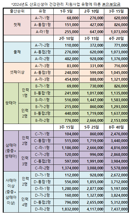 위표는2024년산후도우미정부지원프로그램의주요내용을정리한것입니다.출산가정의구조와필요에따라본인부담금이상이할수있으니,자세한사항은관련사이트를통해확인하시기바랍니다.