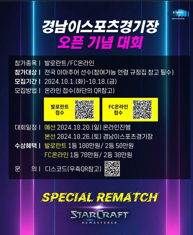 2024년5월,경남이스포츠경기장이드디어문을엽니다!이를기념하여오픈기념대회가함께개최될예정입니다.이대회는아마추어이스포츠선수들을위한무대이며,참가자격에지역제한은없습니다.실력있는아마추어선수여러분의많은도전을기다립니다!