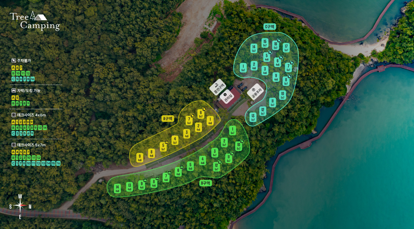 트리캠핑장은 차별화된 캠핑 경험을 제공합니다. 나무 위에 설치된 오두막에서 가을의 정취를 만끽할 수 있습니다. 이곳에서는 다양한 액티비티와 함께 가족과 친구들과의 특별한 시간을 보낼 수 있습니다. 특히, 야경이 아름다워 사진 촬영지로도 인기가 높은 장소입니다. 보시면 차박불가지역, 차박/도킹가능, 데코사이즈, 데코사이즈 별로 있습니다