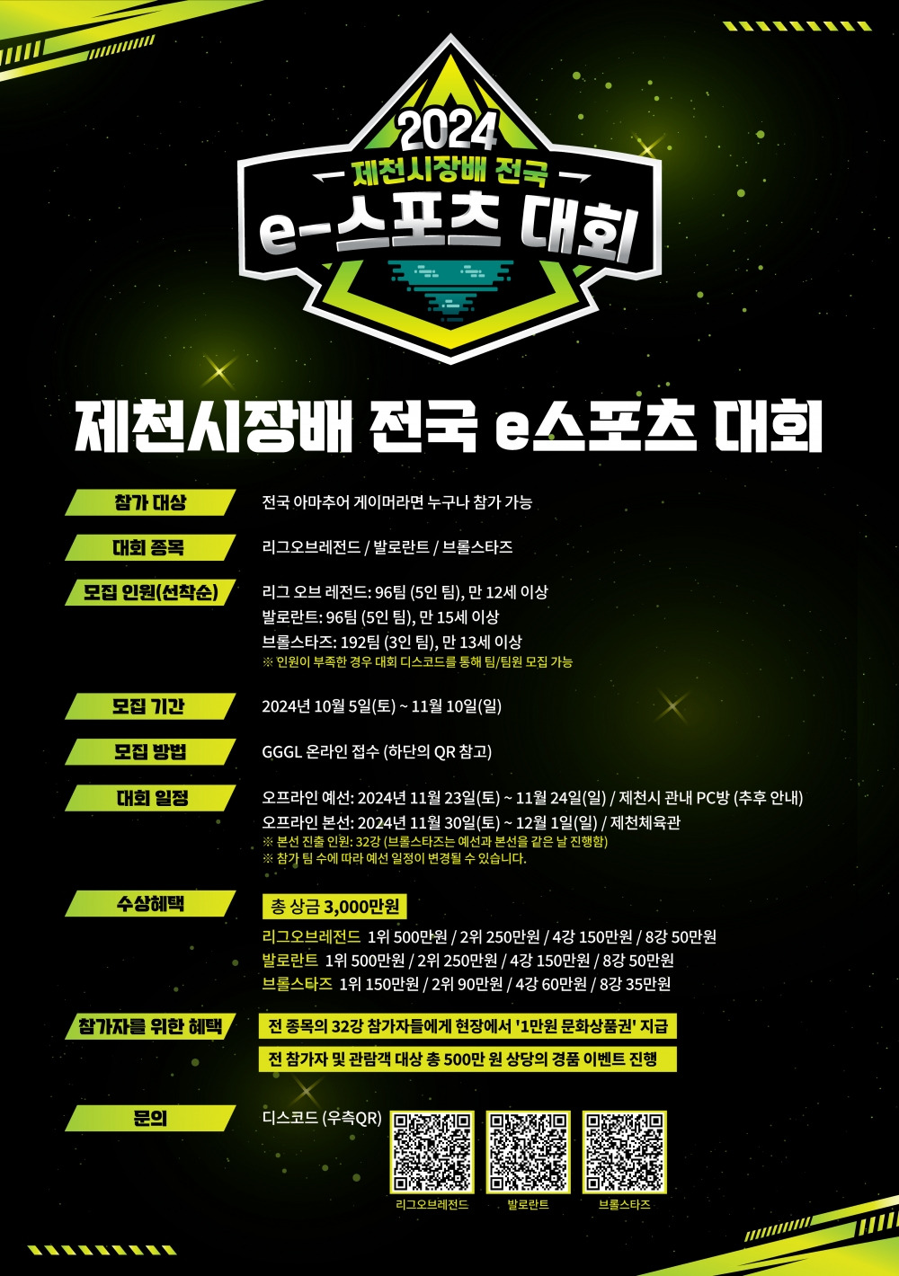 제천에서펼쳐질2024제천시장배전국e스포츠대회가참가자를모집합니다!이번대회는전국의아마추어게이머들을위한특별한무대로,다양한종목에서실력을겨룰수있는기회를제공합니다.관람객을위한현장이벤트와화려한축하공연까지준비되어있으니많은관심과참여부탁드립니다!