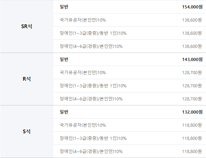 1.티켓가격:티켓가격은SR석,154,000원,R석,143,000원S석,132,000원,A석99,000원입니다아래에사진을참고하시면됩니다