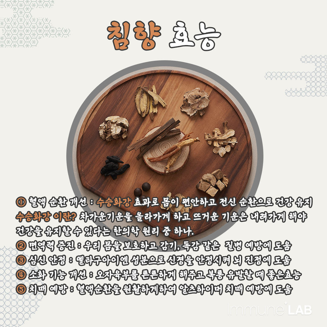 침향환은 수승화강 효과가 있어 신체 균형을 유지하는 데 도움을 줍니다. 차가운 기운을 올리고 뜨거운 기운을 내리는 작용으로 건강을 유지할 수 있습니다.