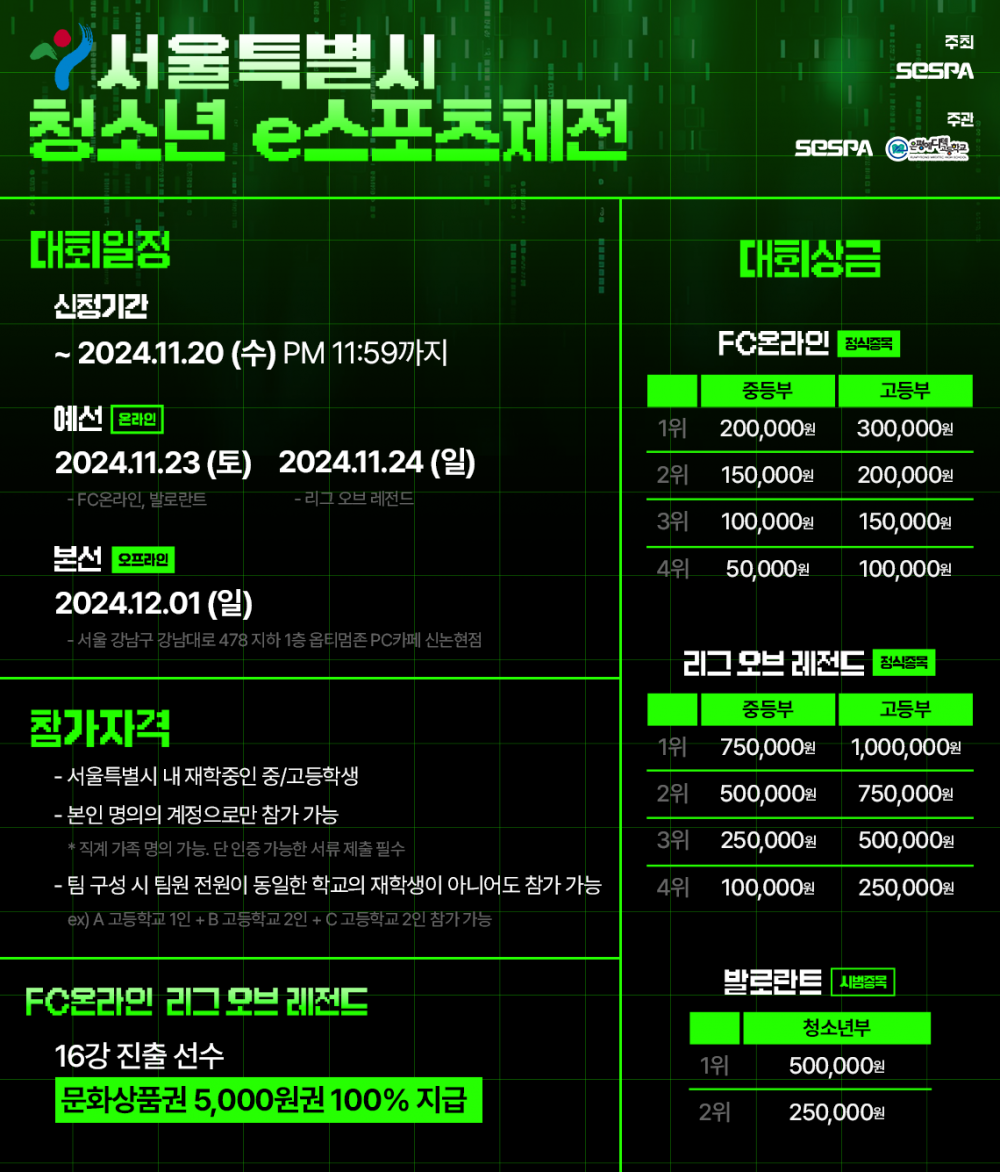 청소년 e스포츠 체전은 서울특별시가 주최하는 만큼 공정하고 수준 높은 대회를 약속드립니다. 게임에 열정을 가진 여러분, 이번 기회를 놓치지 마세요!