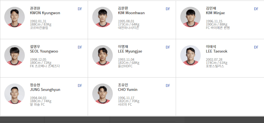 - DF: 권경원, 김민재, 설영우, 이기혁, 이명재, 이태석, 정승원, 조유민, 황문기