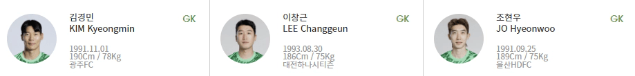 - GK: 김경민(광주FC), 이창근(대전하나시티즌), 조현우(울산 HDFC)