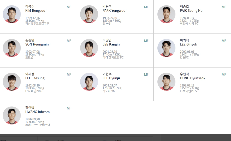 - MF: 김봉수, 박용우, 배준호, 백승호, 손흥민, 이강인, 이재송, 이현주, 정우영, 홍현석, 황인범