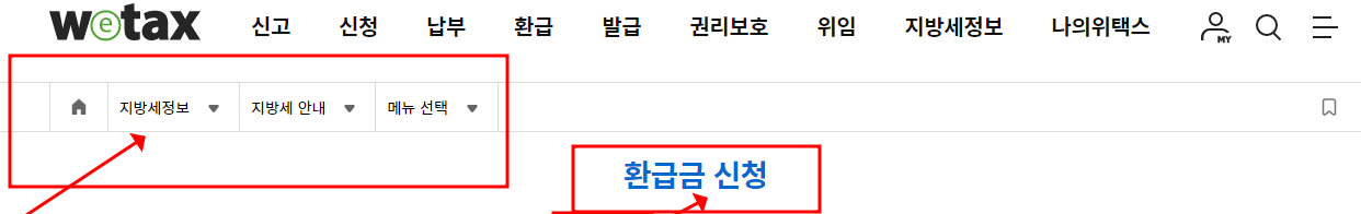 - 로그인 후, 상단 메뉴에서 [지방세 환급] → [환급금 조회/신청]을 클릭합니다.