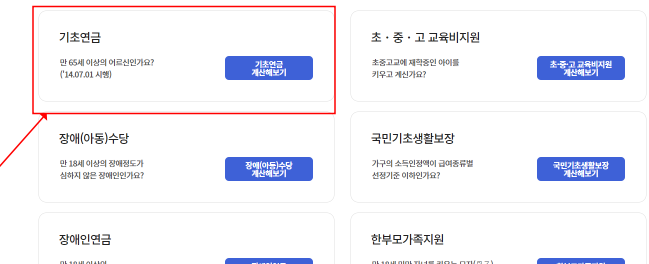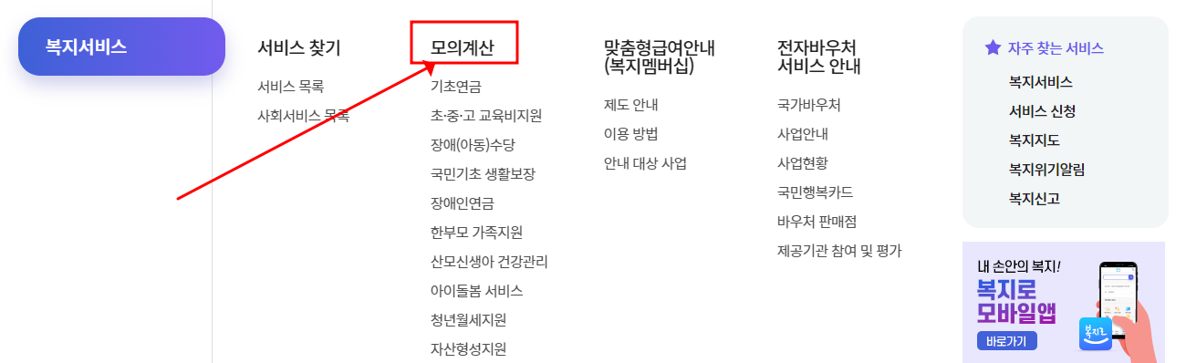 - 상단 메뉴에서 "기초연금 모의 계산"을 클릭합니다.
