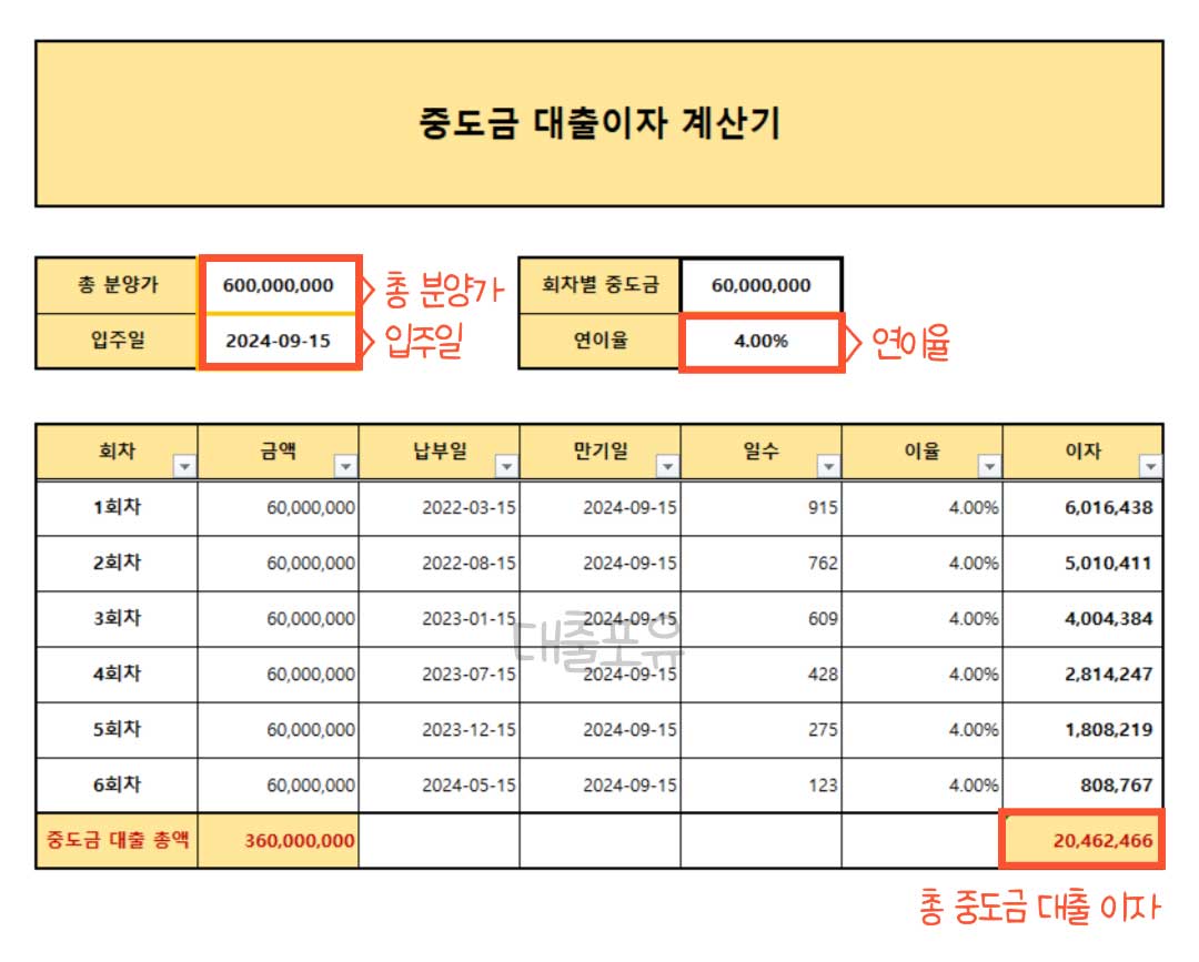 - 만기 일시 상환: 총 이자 = 대출금 × 연 이자율 × 대출 기간(년)