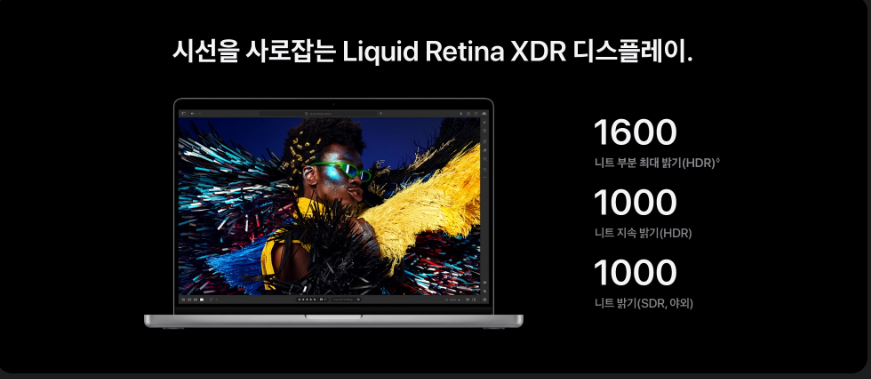 16.2인치 디스플레이로 생생한 색감과 디테일을 제공합니다. ProMotion 기술로 최대 120Hz 주사율을 지원하며, 1,000 니트 밝기와 HDR 지원으로 어디서든 선명한 화질을 즐길 수 있습니다.