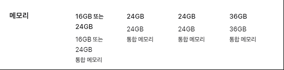 | 모델 구성 | RAM | 저장 공간 | 가격(₩) |