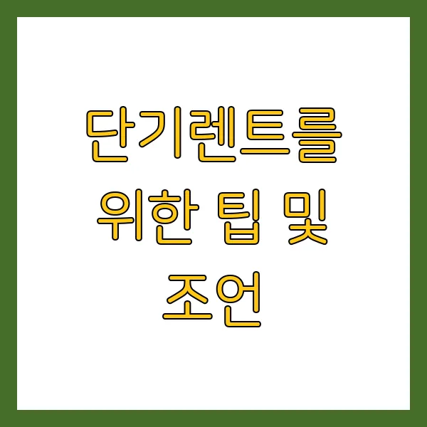 단기렌트를 계획하고 계시나요? 그렇다면 몇 가지 중요한 팁과 조언 이 필요합니다. 단기렌트는 비용 효율적인 대안 으로 인기를 끌고 있으며, 올바른 정보와 준비가 있다면 더욱 경제적이고 편리하게 이용할 수 있습니다. 다음은 단기렌트를 고려할 때 알아두어야 할 몇 가지 유용한 지침입니다.