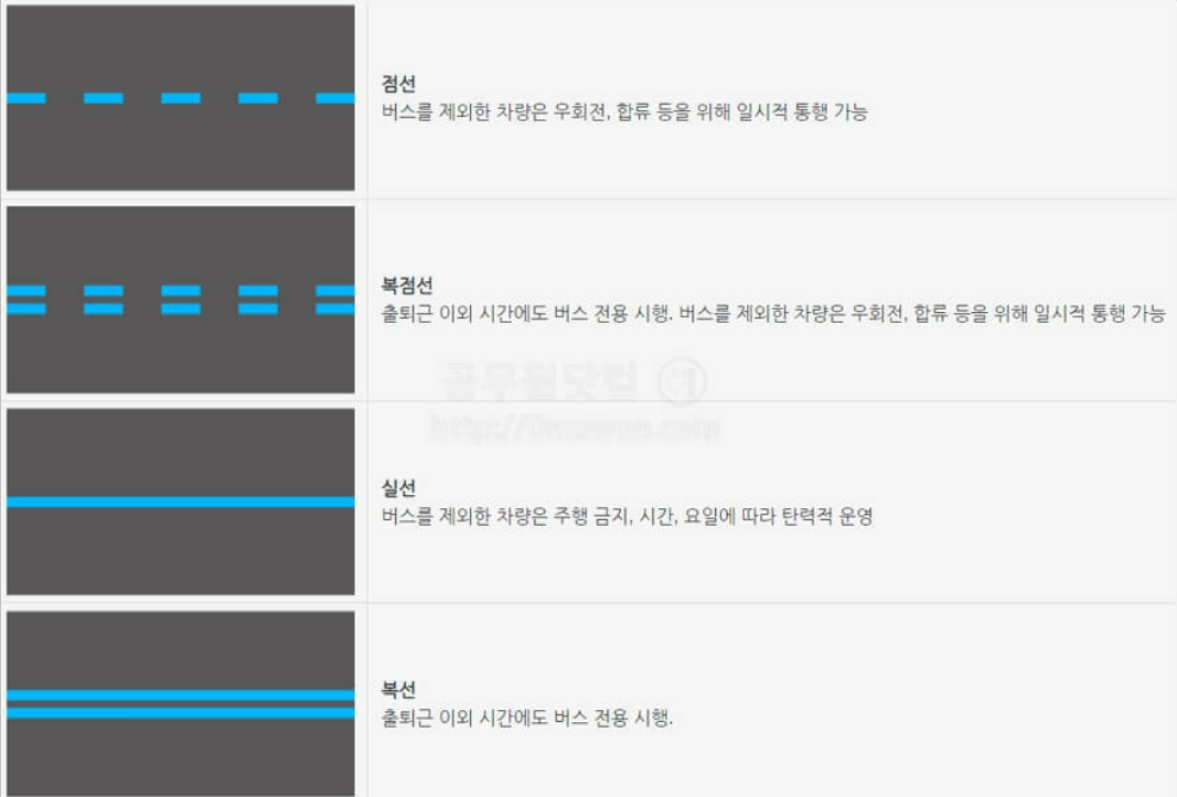 - 청색 복점선 : 출퇴근 이외 시간에도 버스 전용 시행, 버스를 제외한 차량은 우회전, 합류 등을 위해 일시적 통행