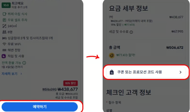 - 예약 단계에서 ‘쿠폰코드 입력’ → 코드 붙여넣기 → 적용 확인