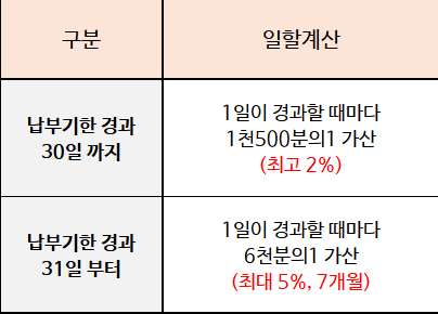 - 납부 기한이 지난 후에는 최대 9%의 연체료가 부과됩니다.