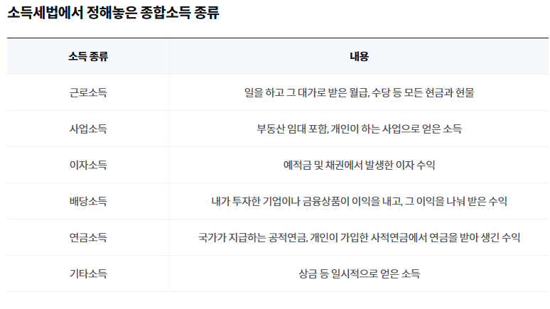 - 종합소득세: 사업소득, 임대소득, 이자·배당소득, 기타소득 등을 포함해 1년에 한 번 본인이 신고
