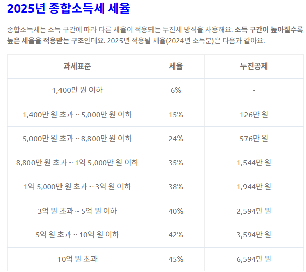 2025년부터 고소득 구간에 대한 세율이 인상되었습니다. 다음은 최신 소득세율표입니다: